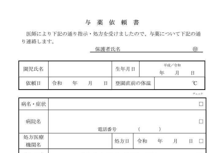 保育時間中の服用が必要な場合与薬依頼書に必要事項を記入していただき、薬と共に職員へ直接手渡ししていただきますようお願い致します。与…