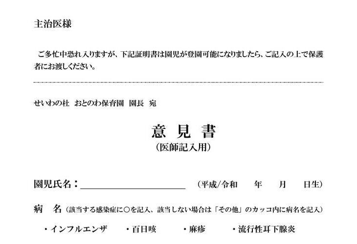 該当する感染症に罹患した後、回復して保育園に登園する際は医師に登園許可書を記入してもらい、登園時に園へご提出ください。意見書(医師…