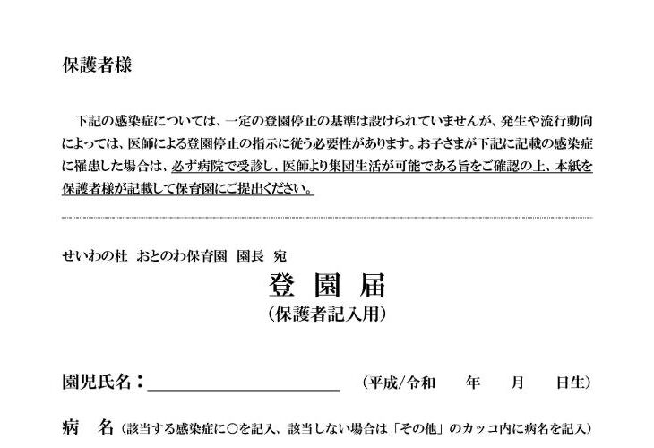 該当する感染症に罹患した後、回復して保育園に登園する際は、保護者の方が登園届を記入し、登園時に園へご提出ください。登園届(保護者記…