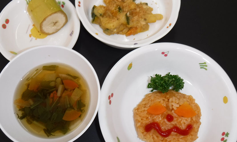 給食室の先生たちが、子どもたちのためにかわいい「おばけごはん」を用意してくれました!