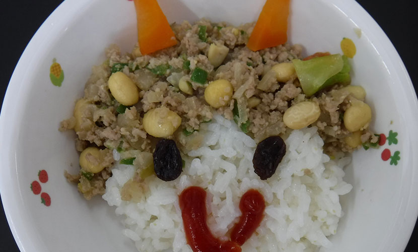 給食 節分の特別メニュー! 食を通して季節を感じる、 節分の特別メニューをいただきました 節分の日にちなんだ給食メニュー 子どもたちが楽しみにしていた“鬼さんごはん”が登場しました。 ごはんの上にはそぼろと大豆を使った炒め物がのせられ、にんじんの角やケチャップの口、レーズンの目で鬼の顔がかわいらしく表現されています。栄養士さんが工夫を凝らして作ってくださったメニューに、子どもたちは「かわいい!」「たべるのがもったいない!」と大喜び。食育の一環として、季節の行事を楽しみながら食への興味も育まれる、笑顔あふれる食事の時間となりました。